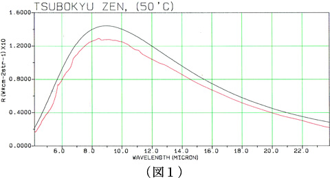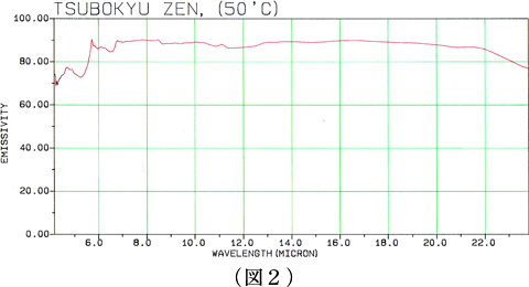 お分かりの通り、50℃になりますと、平均して遠赤外線を放射しています。このように、遠赤外線放射率の高いシートをお肌に密着させて使用することが、「つぼきゅう禅」の一番の特徴です。
